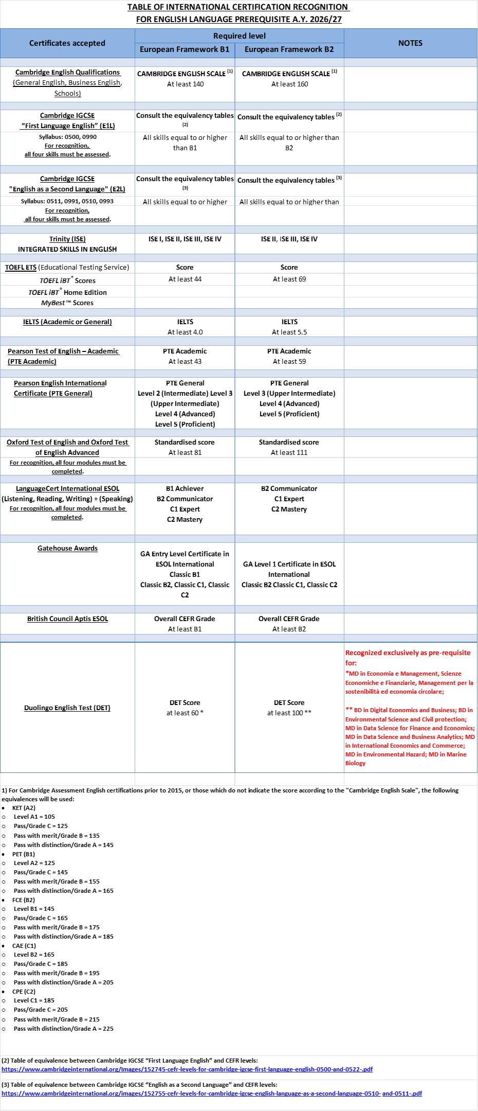 Students who wish to matriculate in a degree program delivered in English must demonstrate an English language proficiency of level B2 (according to the CEFR), through one of the certifications recognized by our University or other documentation.